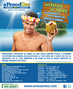 Nuova Campagna Un'Estate al Mare Ancora una campagna A Peso d'oro, questa volta per sponsorizzare la promozione dell'estate. D'estate si sa il primo pensiero sono proprio le vacanze... per questo A Peso d'Oro ha pensato ad una promozione che permette di ottenere la migliore quotazione per la vendita del proprio oro usato. Il pay off della campagna: 'una promozione che lascia il segno' richiama simpaticamente all'immagine in primo piano, dove il nostro testimonial, Francesco Benigno, acconciato in modo volutamente kitch, sfoggia con orgoglio il segno delle vecchie catenine vendute per regalarsi appunto: un'estate al Mare!